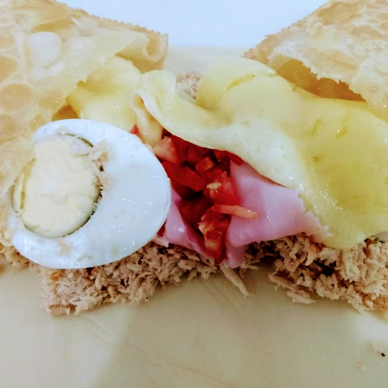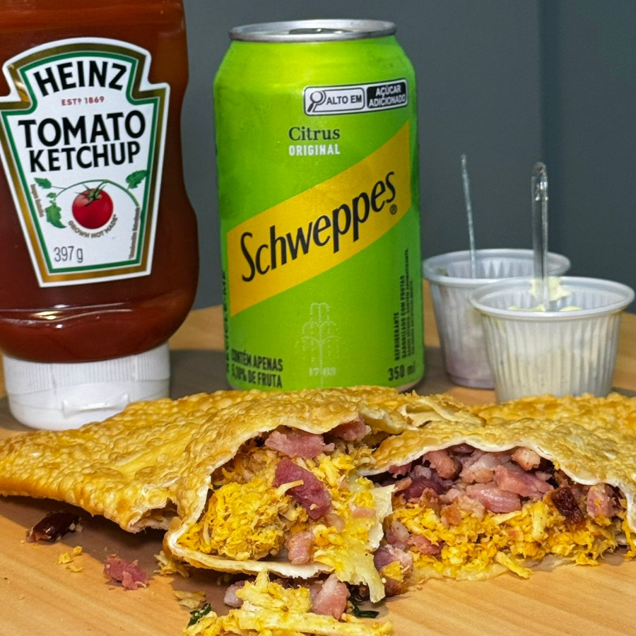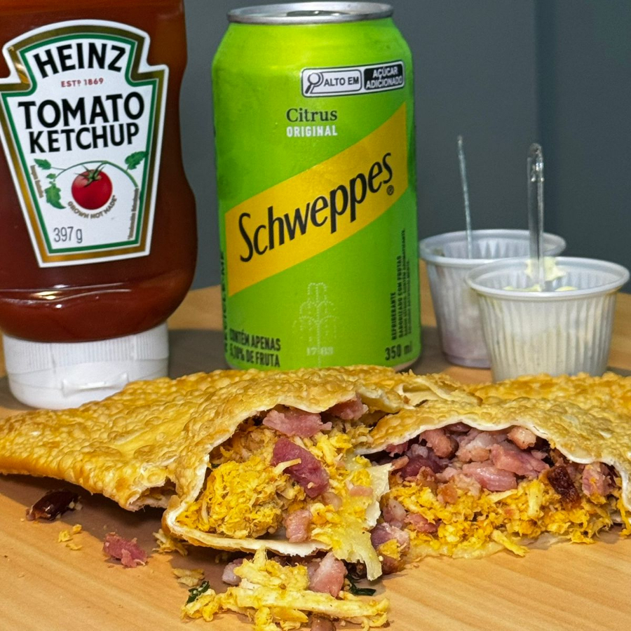 frango, catupiry, presunto. queijo, presunto, ovo, tomate e oregáno