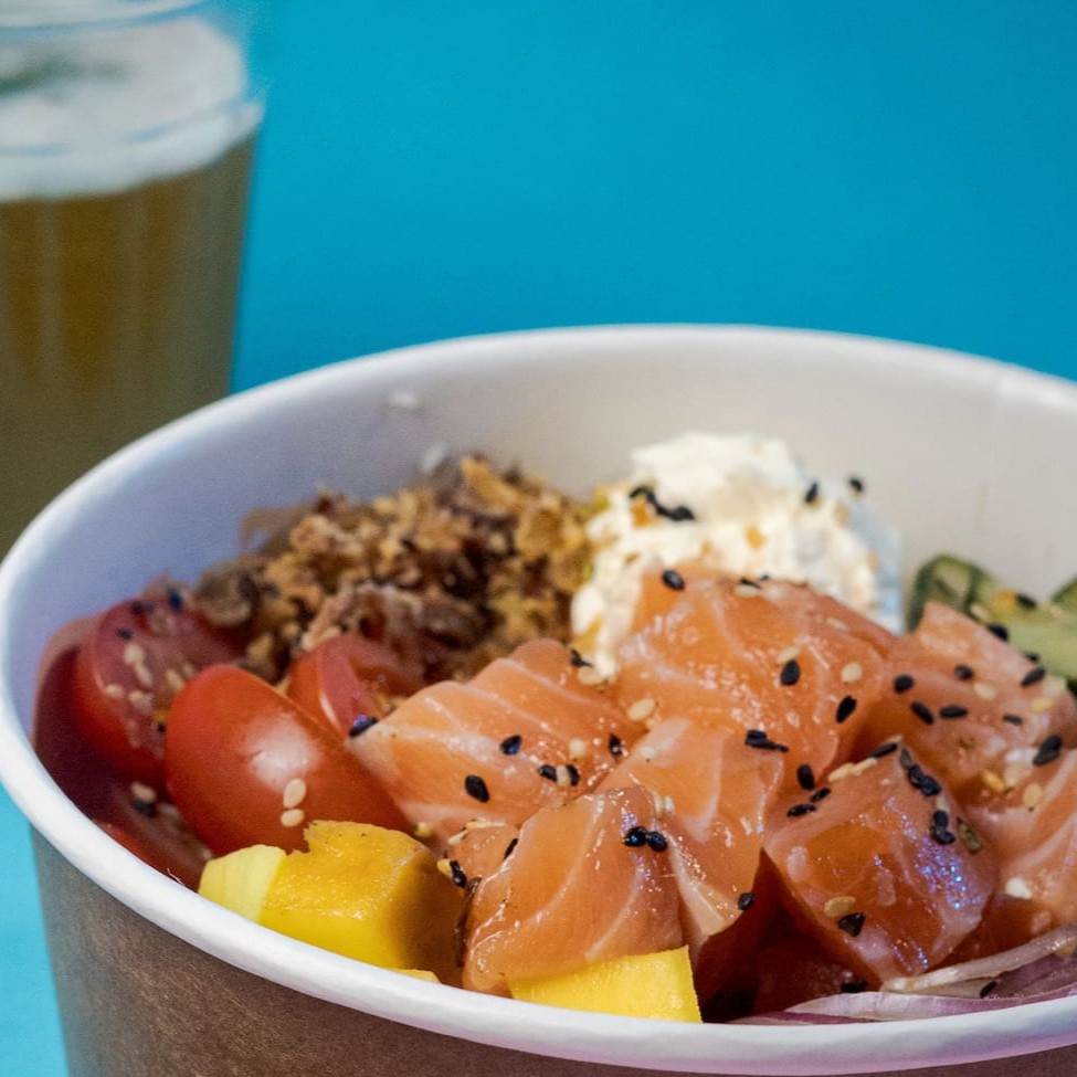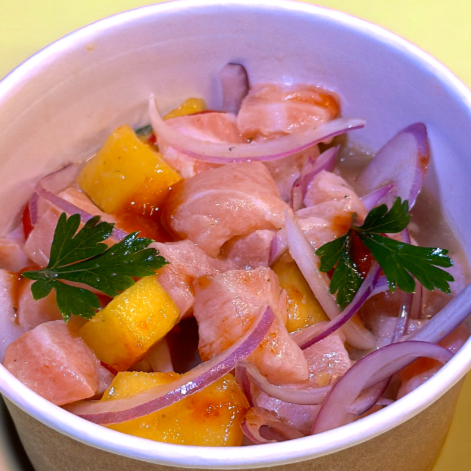 Preparado na Hora! Acompanha 120g de Salmão temperado com óleo de gergelim, limão, shoyu, cebola roxa, coentro e manga.