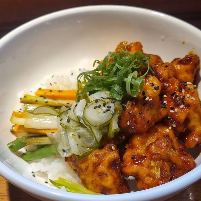 Couve flor empanado com molho agridoce picante acompanhado de arroz oriental e legumes.