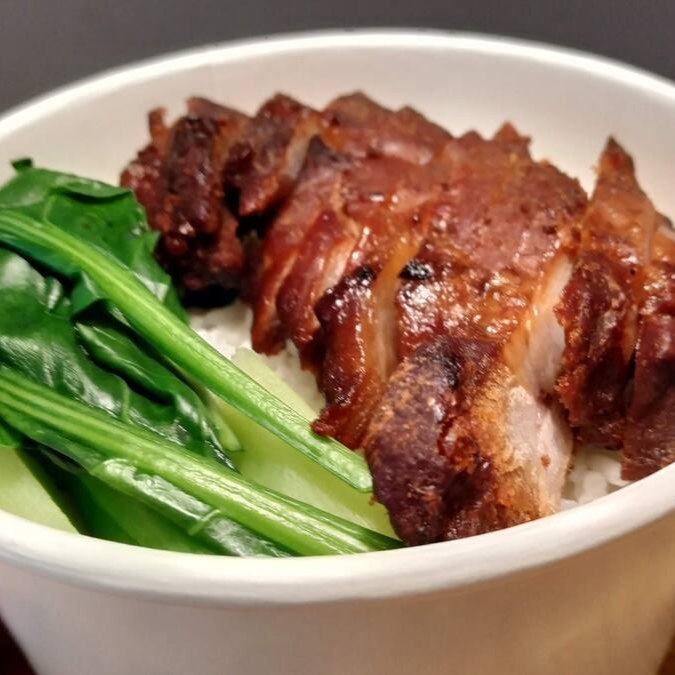 叉燒飯 | Fatias de copa glaceada acompanhada de arroz oriental e legumes.