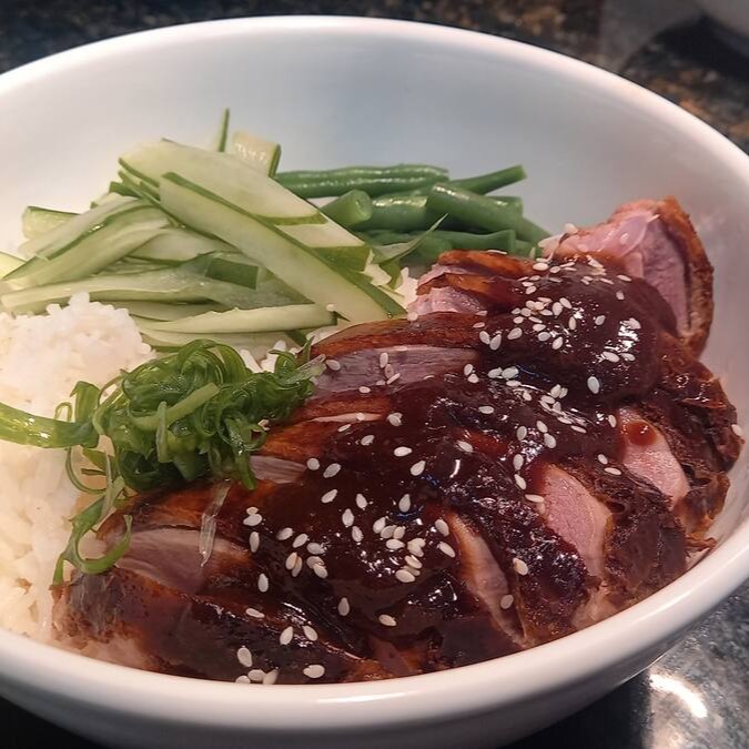 烤鴨飯 | Fatias de Pato Laqueado (com osso) acompanhado de arroz oriental e legumes.