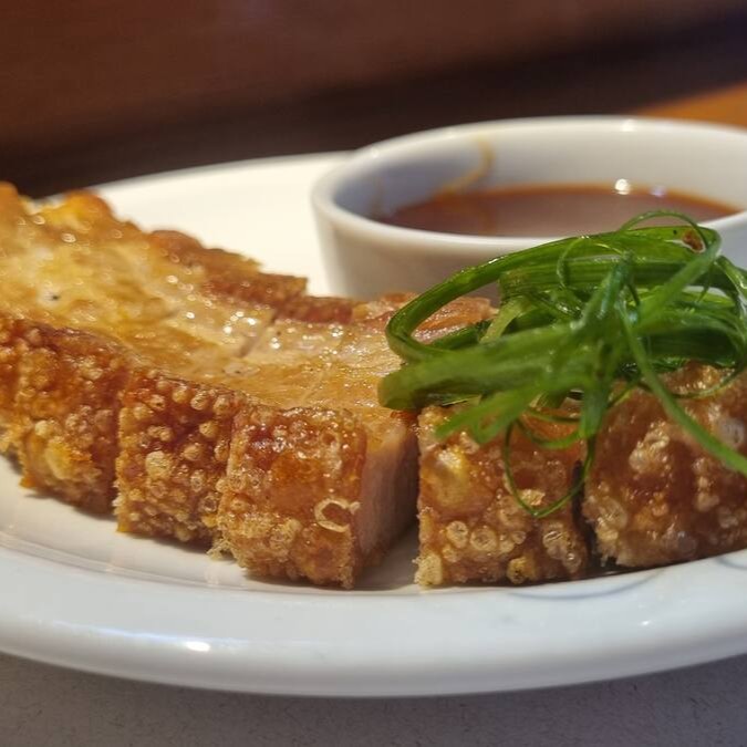 Deliciosa e crocante pancetta pururucada ao estilo chinês acompanhado de molho da casa.
