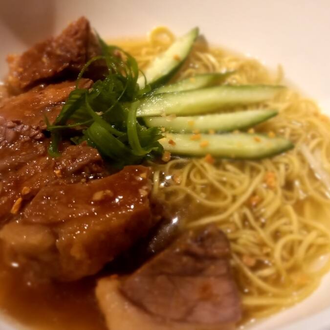 especiarias chinesas, macarrão artesanal, caldo de camarão e legumes.