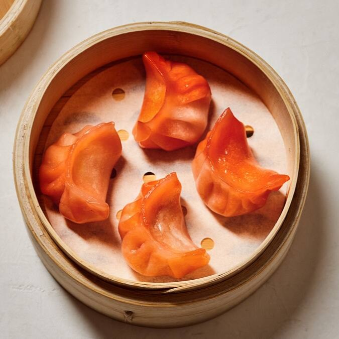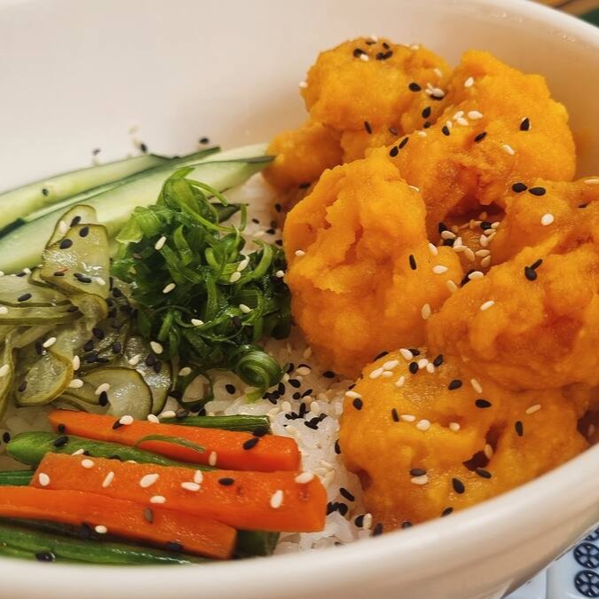 Camarão empanado coberto com delicioso molho de gema curada acompanhado de arroz oriental e legumes.