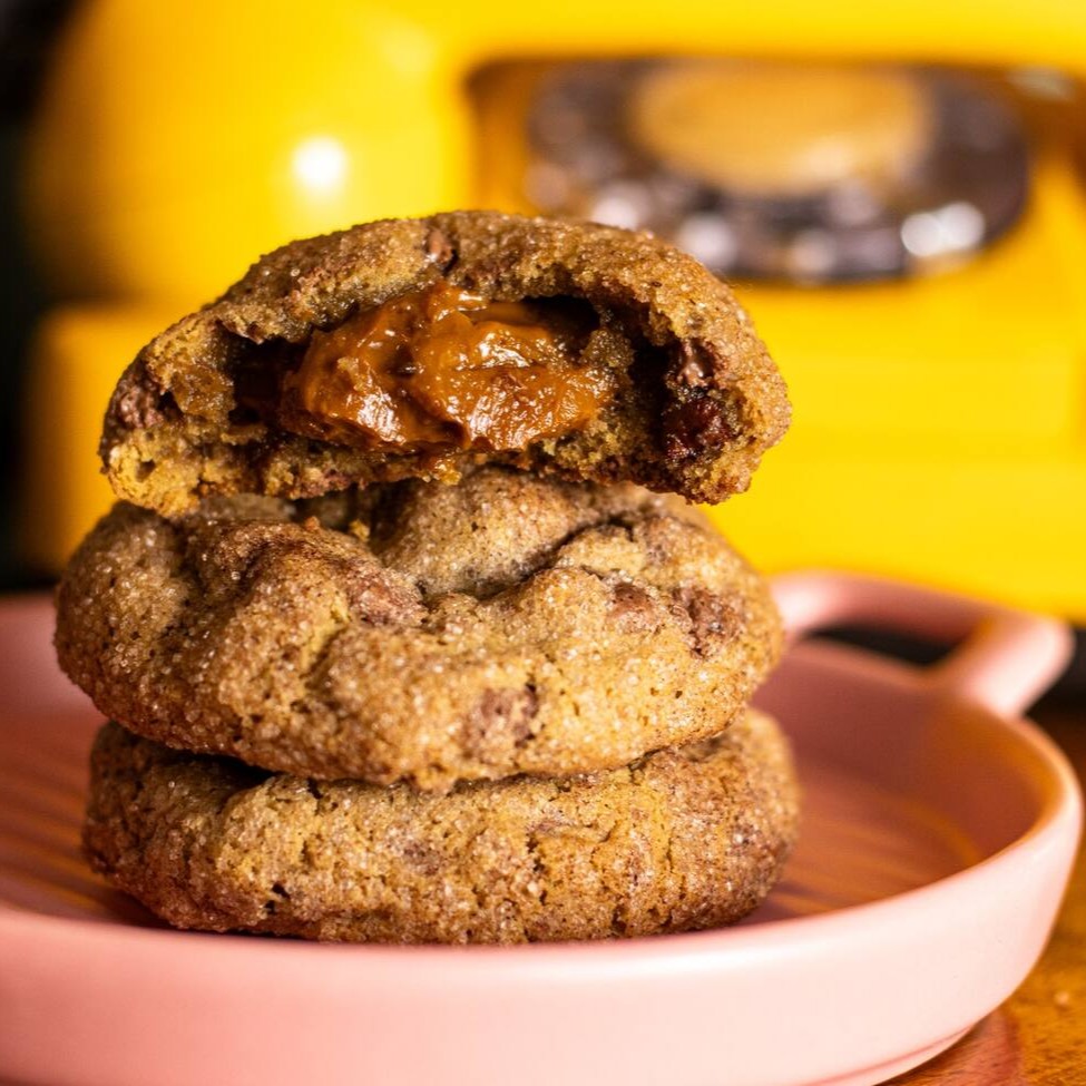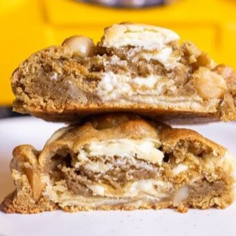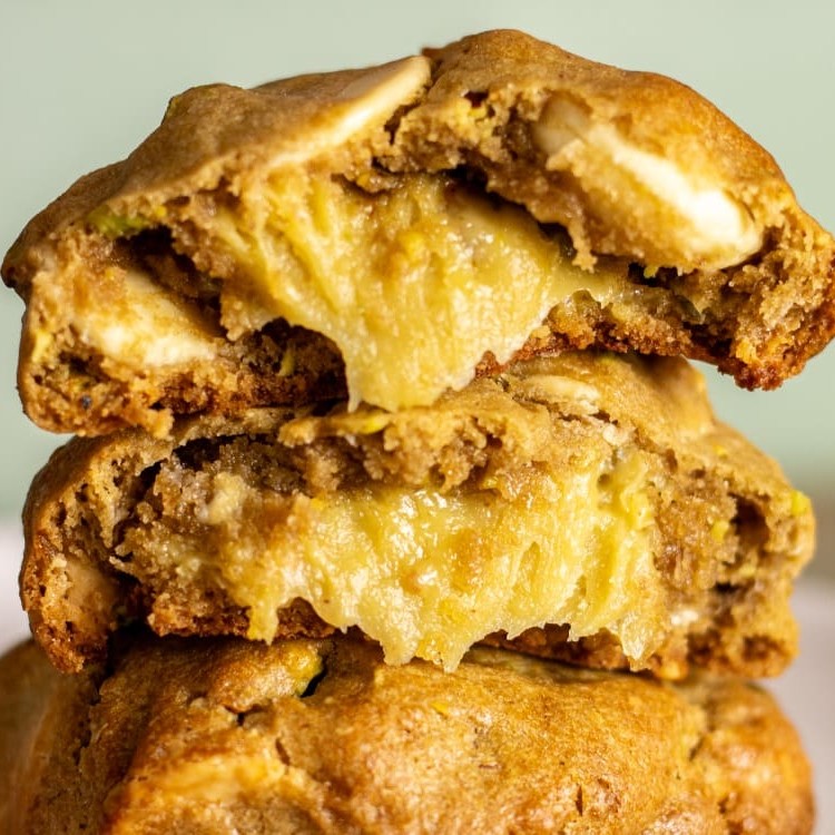 Massa de cookie com pedaços de pistache, chocolate branco, recheado com brigadeiro de pistache. Aprox. 70g