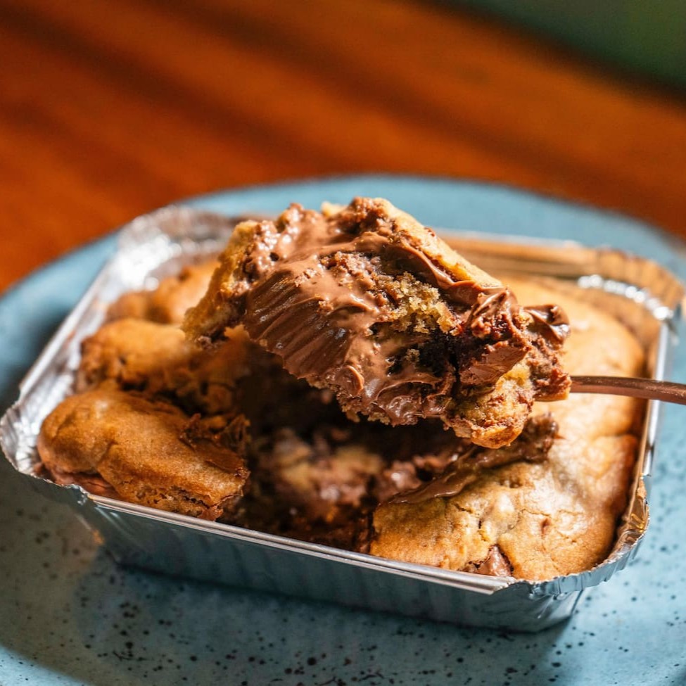 Marmitinha de cookie de massa de baunilha com creme de chocolate branco, Nutella e chocolate Kinder.