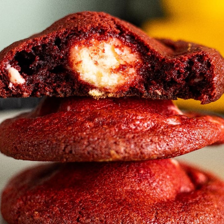 Massa de red velvet com gotas de chocolate branco recheado com muito brigadeiro de leite Ninho.