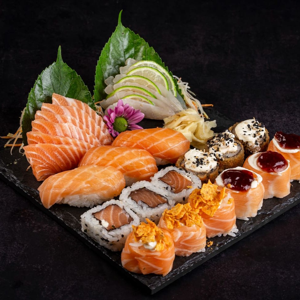 5 sashimi de salmão 5 niguiri de salmão 5 uramaki de salmão 5 uramaki skin couve 5 kapamaki 5 shakemaki 5 hot couve crispy 5 hot holl