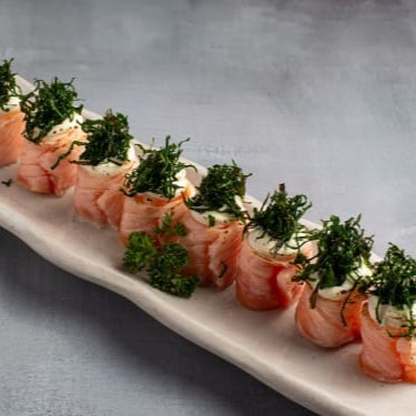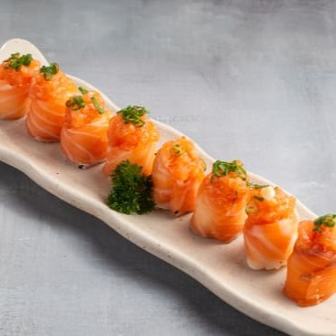 Este prato apresenta o salmão mais fresco e suculento, habilmente enrolado em um arroz especialmente preparado. O recheio é uma deliciosa mistura de salmão batido, que traz um sabor maravilhosamente rico e textura cremosa. Para finalizar, uma pitada de cebolinha acrescenta um toque refrescante e aromático. Esta porção é ideal para amantes de sushi que apreciam a combinação perfeita entre o sabor intenso do salmão e a sutileza do arroz.