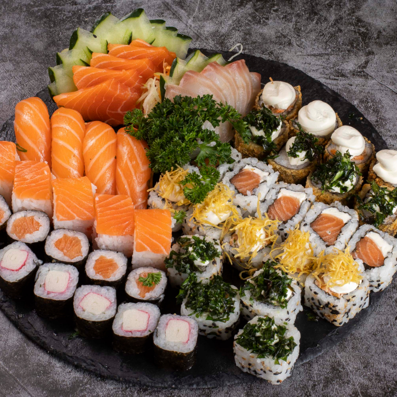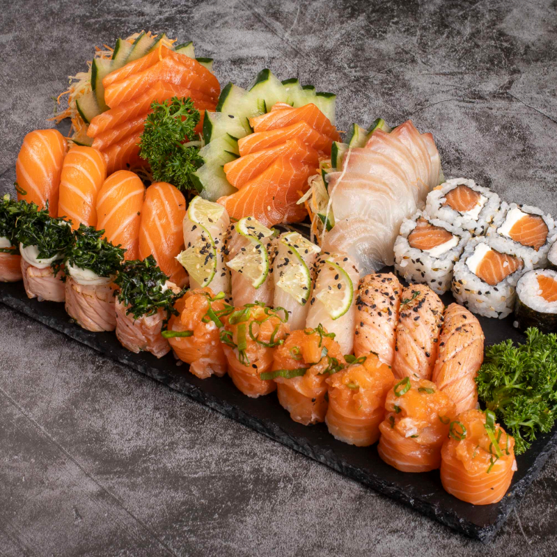 10 Sashimi de salmão 5 Sashimi de tilapia 4 Niguiri de salmão 4 Niguiri de tilapia 3 Niguiri de salmão massaricado 4 Joe de salmão 4 Uramaki de salmão 4 hossomaki de salmão 6 joe chico cesar