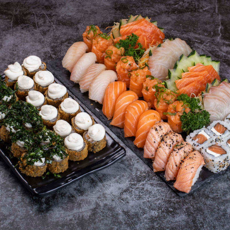 6 sashimi salmão 6 sashimi tilápia 4 neguiri de salmão 5 uramaki salmão 5 uramaki grelhado 5 baterá de salmão 5 shakemaki de salmão 5 kanimaki 4 uramaki skin 5 hot holls.