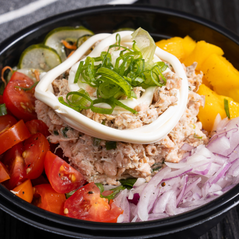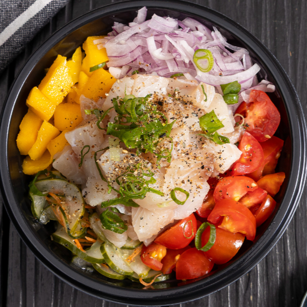 Cubos de tilápia temperada com leve toque cítrico, servidos com gohan, manga, pepino, cebola roxa e tomate cereja Sabor suave e equilibrado para quem ama peixe branco.