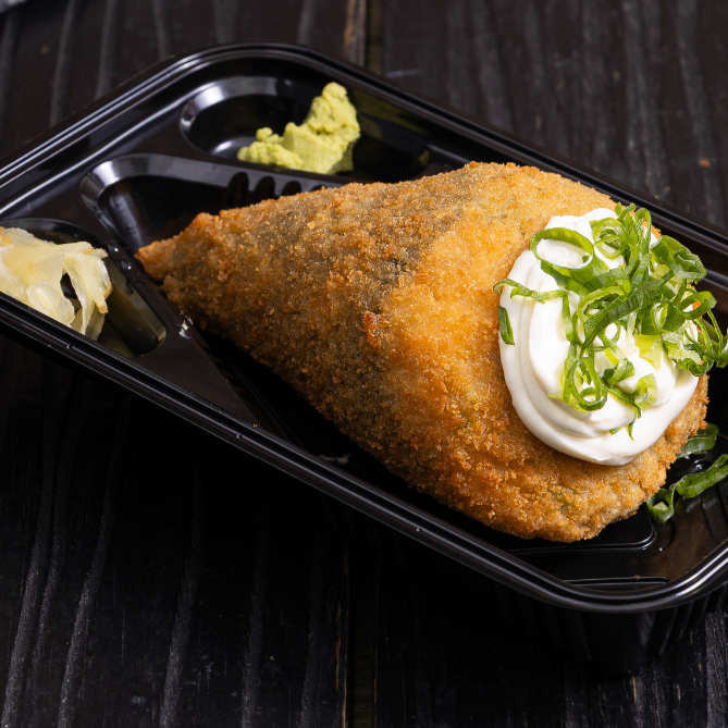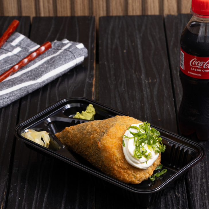 Crocante por fora, surpreendente por dentro: recheio generoso de salmão grelhado , cream cheese e cebolinha. Uma explosão de sabores para quem ama frutos do mar! Serve 1 Pessoa (200 gramas)
