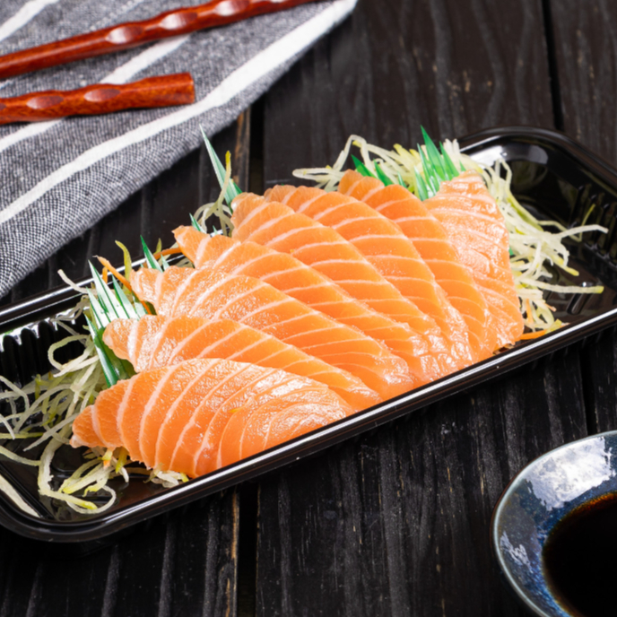 Sashimi de salmão levemente maçaricado, com sabor defumado suave e textura macia. (8 fatias)