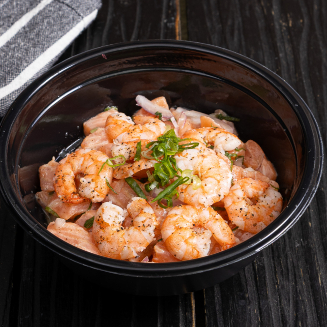 Salmão em Cubos, 8 Unidades de Camarão, Cebola Roxa, Cebolinha, Coentro, e Molho da Casa. -300 Gramas-