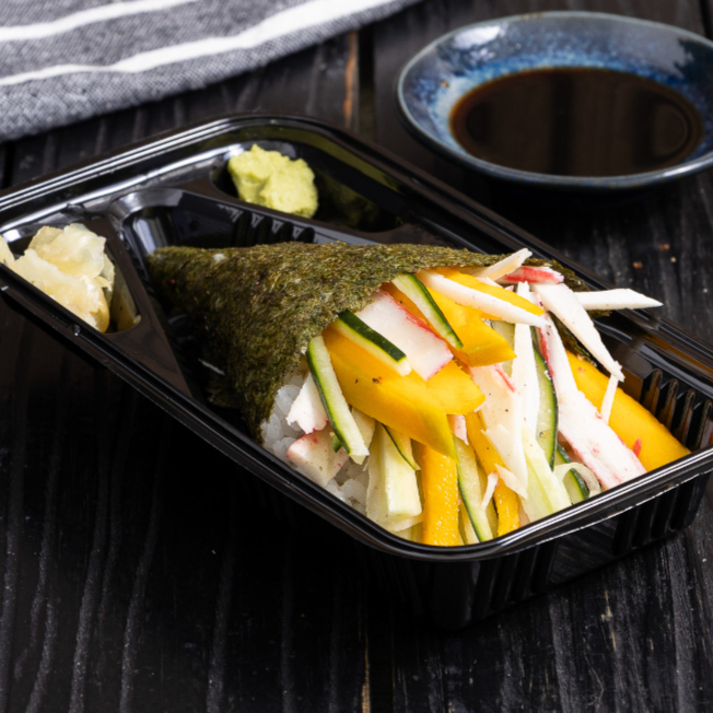 Temaki California, completo com Cream Cheese e Cebolinha. Recheio Manga, Kani e pepino. -150 Gramas-