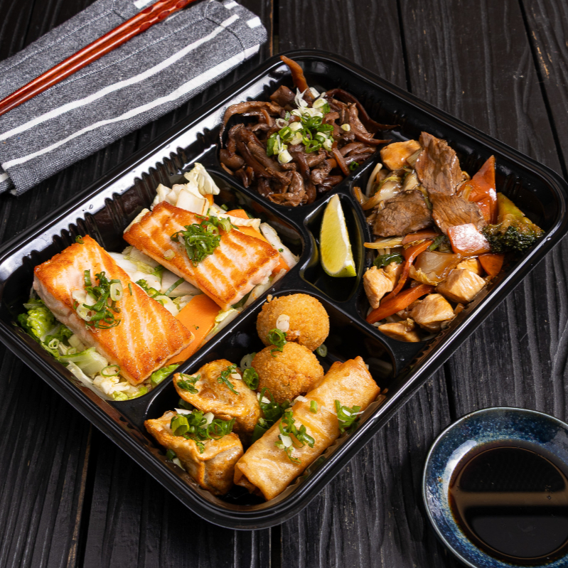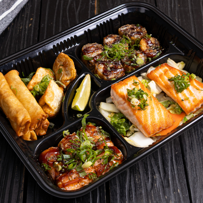 50 Gramas de Yakisoba Misto, 50 Gramas Shimeji, 2 Pedaços de Salmão Grelhado 40 gramas Cada (Acompanha legumes refogados), 2 Harumaki de queijo, 2 Guioza Bovina, 2 Bolinhas fritas de Salmão Grelhado. *Este prato não pode sofrer alterações*