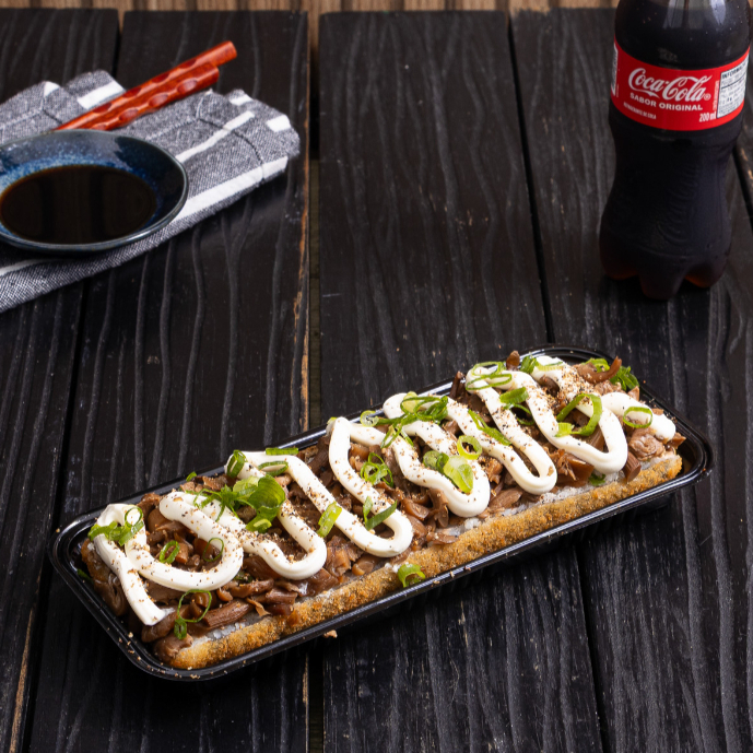 Arroz empanado no formato de hot dog, recheado com cogumelos shimeji salteados, cream cheese e toque de cebolinha. Leve, saboroso e 100% vegetariano. Serve 1 Pessoa.