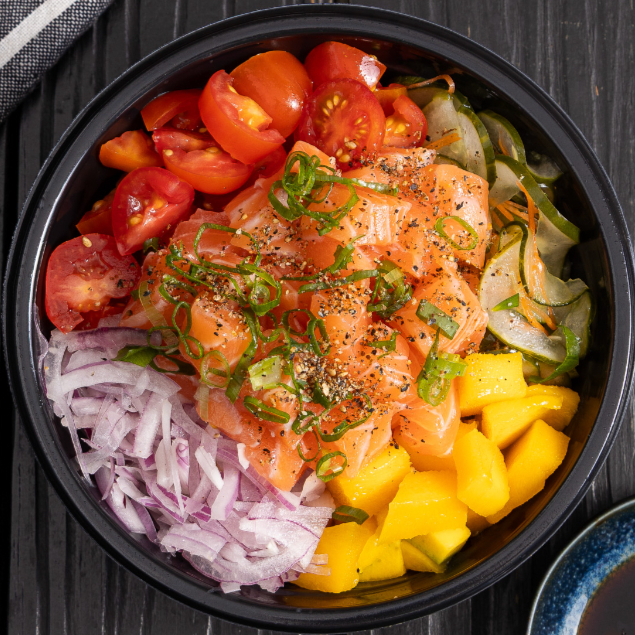 Cubos de salmão grelhado no ponto certo com arroz gohan, manga, pepino, tomate cereja, cebola roxa. Uma explosão de sabores quentes e frios na medida certa.