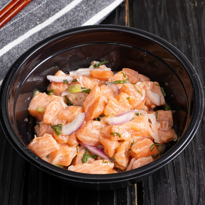 Salmão em Cubos, Cebola Roxa, Cebolinha, Coentro, Tomate Cereja e Molho da Casa. -300 Gramas-