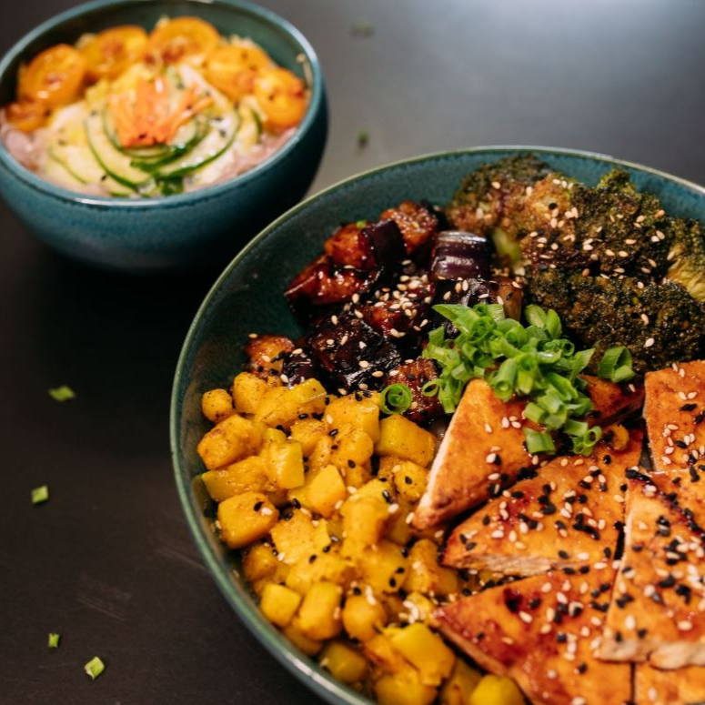 Tofu assado, finalizado na frigideira com o molho da casa, com arroz gohan, legumes salteados. Acompanha salada.