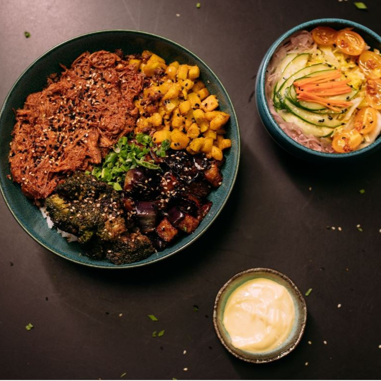 Receita coreana de pulled pork com pasta de pimenta gochujang, com arroz gohan, legumes salteados. Acompanha salada e zabinese.