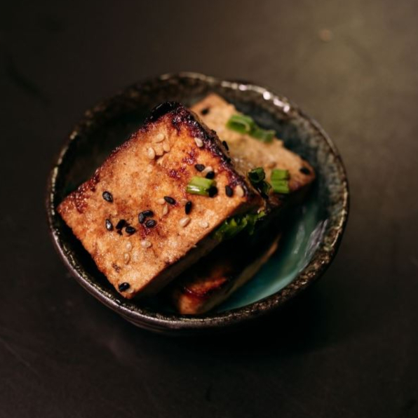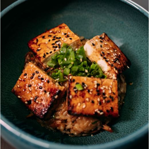 Porção extra de tofu assado, para complementar arroz frito e donburi. (Aproximadamente 100g)