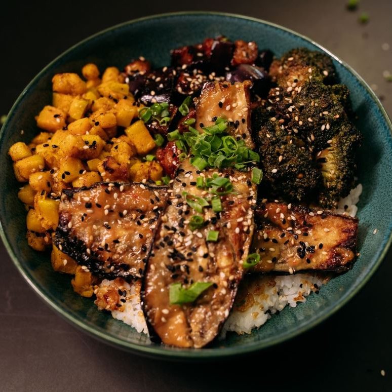 Berinjela japonesa assada e perfeitamente glaceada com um molho de missô agridoce. Servida sobre arroz gohan e acompanhada de legumes salteados e saladinha do dia. (Aproximadamente 600g)