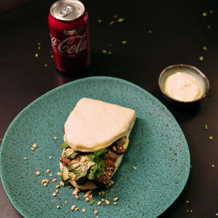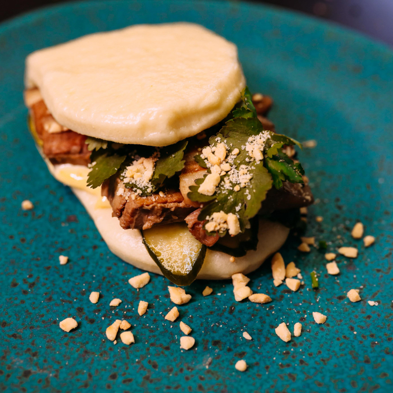 Bao recheado com pulled pork desfiado e suculento, com pasta de pimenta gochujang. O recheio é servido com picles de pepino e a nossa zabinese de kimchi.