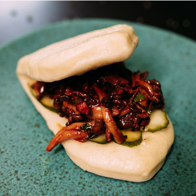 Bao recheado com cogumelos shimeji salteados e finalizados com molho de pimenta gochujang. Servido com relish de pepino fresco e gergelim torrado.