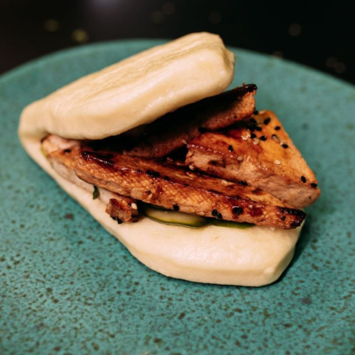 Fatias de tofu tostado, servidas em um bao macio com relish de pepino. Acompanha a sua escolha de molho.