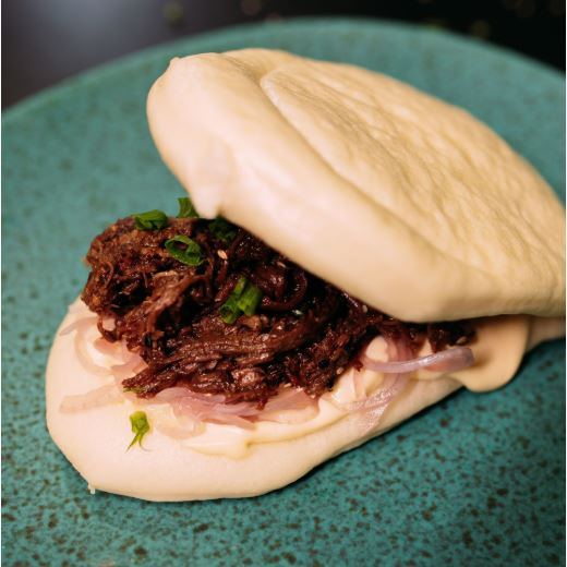 A maciez do cupim desfiado é o destaque deste bao. O recheio é servido com relish de cebola roxa e a maionese caseira de wasabi.