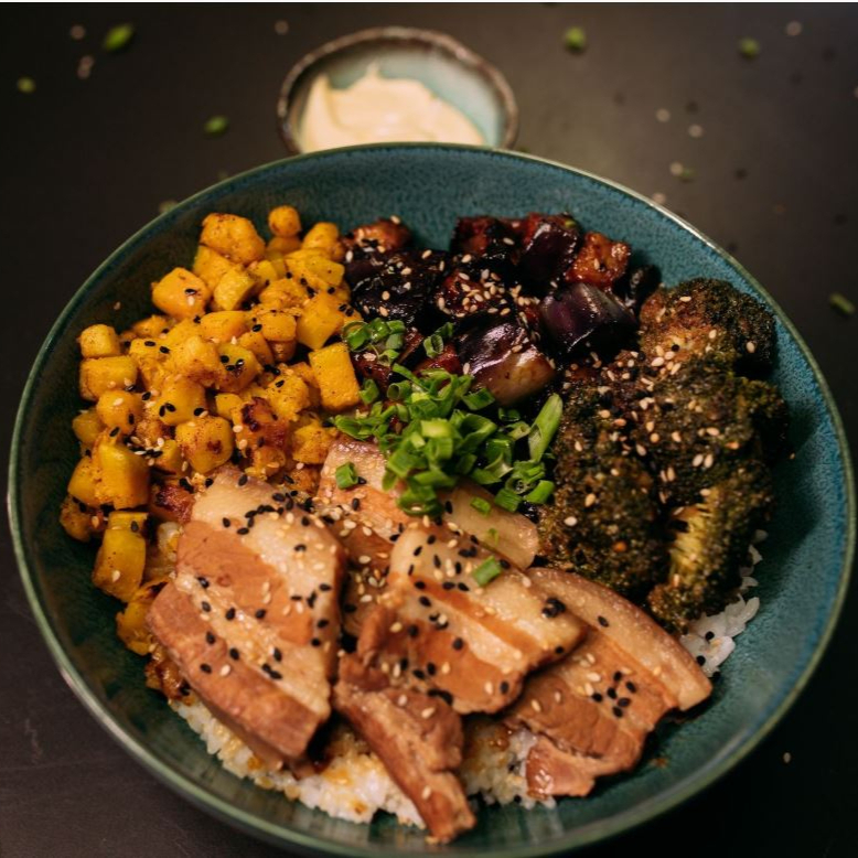 Panceta cozida no estilo taiwanês, com arroz gohan, legumes salteados. Acompanha salada e zabinese.