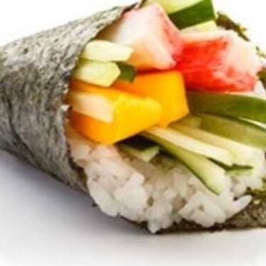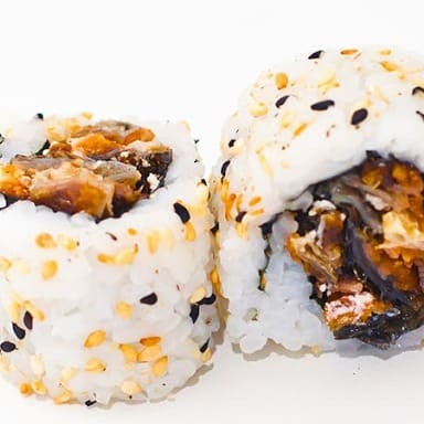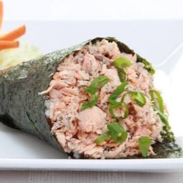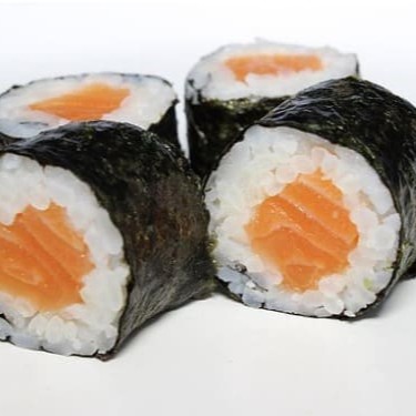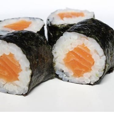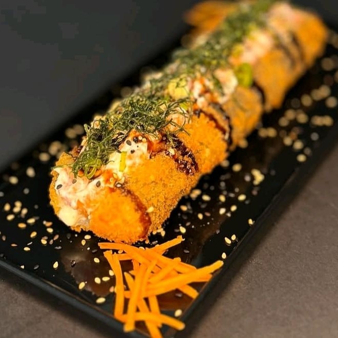 Um enrolado de nori por fora , por dentro Arroz Japones com Salmão empanado na Farinha panko e frito.