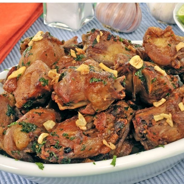 Coxa de frango sem osso ,temperado e frito salpicado com alho e cebolinha
