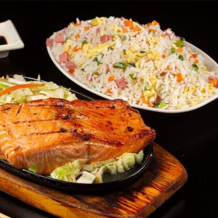 Posta de salmão grelhada com azeite , acompanha legumes na manteiga e arroz yakimeshi.