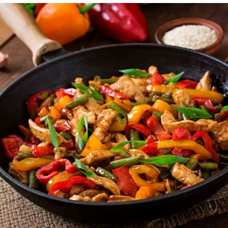 Cubos de peito de frango ,pimentão verde ,cebola ,champignon e amendoim ao molho de soja