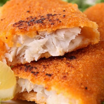 Isca de tilapia , empanada frita e salpicada com alho e cebolinha.