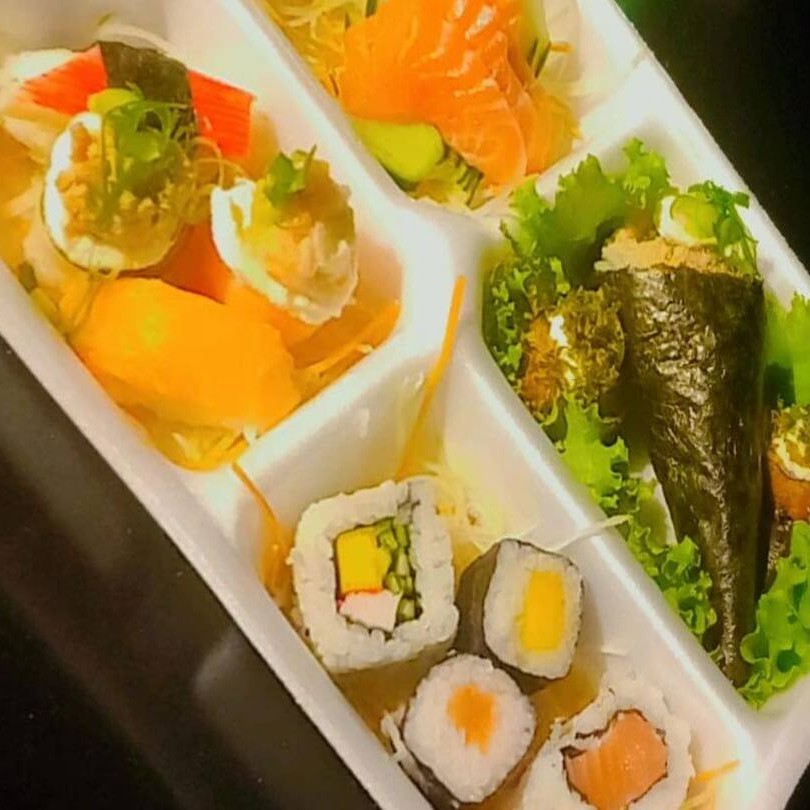 Acompanha: 1 shimeji 1 salmão grelhado 3 mini rolinhos 1 mini temaki grelhado 6 sashimis variados 10 sushis variados
