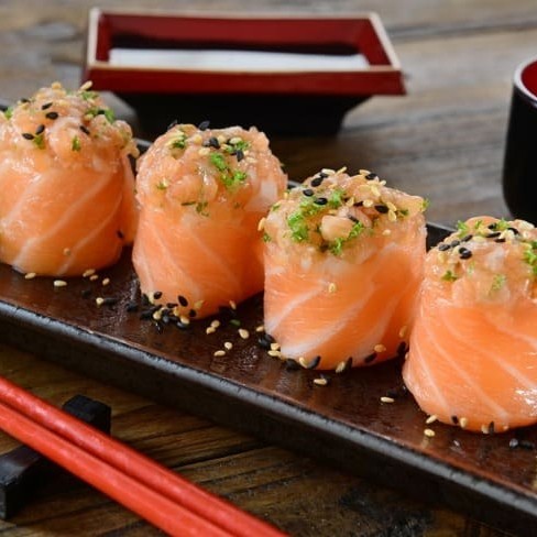 Apresentando o 'Burger de Salmão Cru', um prato sob a cativante categoria de 'Sushi Burguer'. Este prato encantadoramente único é preparado com um suculento hambúrguer de arroz gohan, cuidadosamente empanado na crocante farinha panko e frito à perfeição. O centro deste requintado hambúrguer esconde um delicioso recheio de salmão cru de alta qualidade, suavemente misturado com creme de queijo cremo