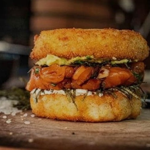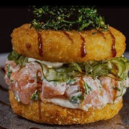 O 'Burger Hot Roll' é uma fusão criativa e deliciosa da culinária japonesa com a americana. Este Sushi Burger é composto por um suculento e magnífico 'burger' de arroz gohan, meticulosamente empanado na farinha panko para garantir uma textura crocante e irresistível após ser delicadamente frito. No seu interior, encontra-se um recheio supremo de salmão cuidadosamente grelhado e empanado, que apres
