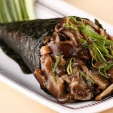 Um enrolado de nori por fora , por dentro Arroz Japones com banana canela empanado na Farinha Banco e frito