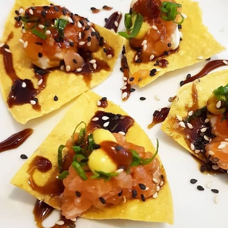 Tradicional sushi frito, recheado com salmão grelhado, regados com cream cheese molho taré e couve crysp.
