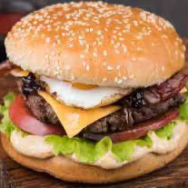 Pão bem macio, hambúrguer, bacon, mussarela, alface, tomate, ketchup e maionese.