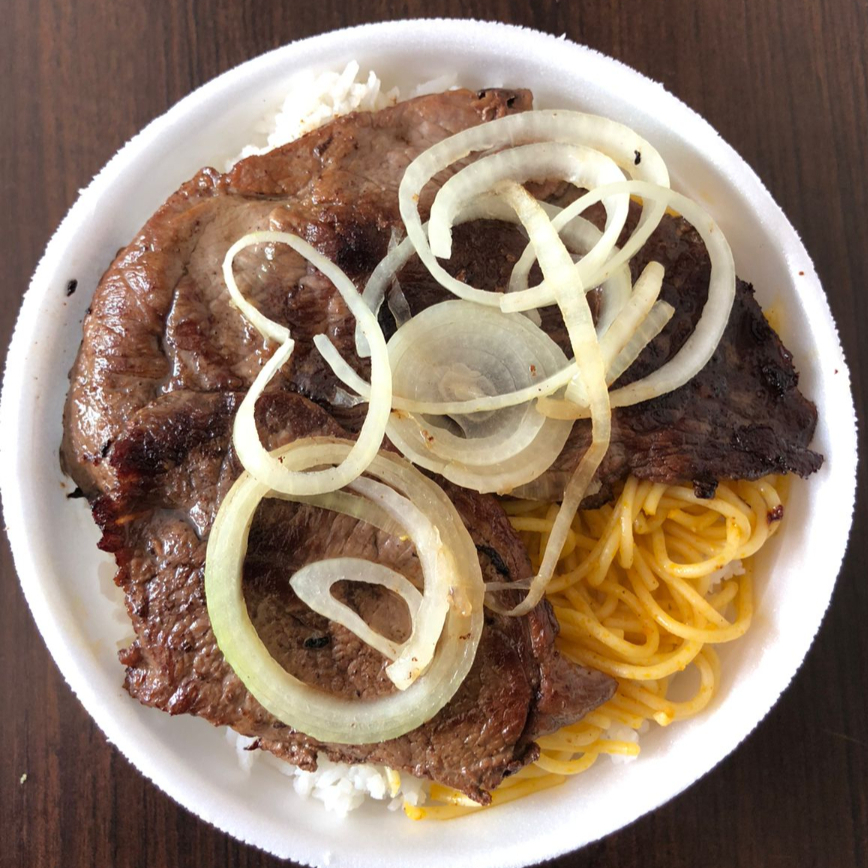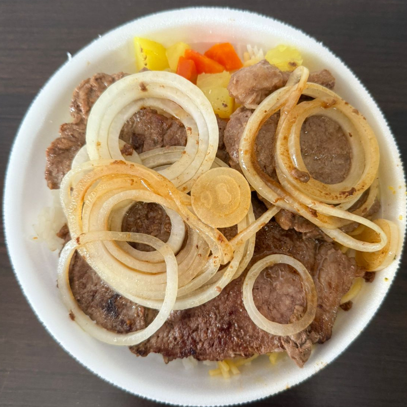 Marmita de bife acebolado, acompanhado de arroz, feijão, acompanhado de uma coca-cola lata, e brinde de cortesia.