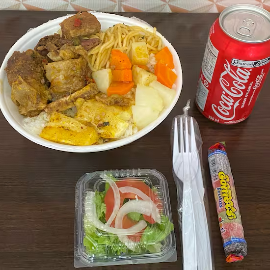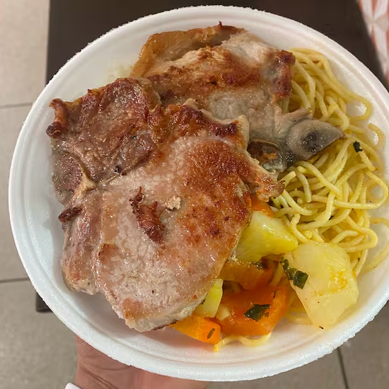 Acompanha: Arroz, feijão, macarrão, legumes, bisteca suína na chapa, Coca-Cola lata de 350ml e uma cortesia da casa.
