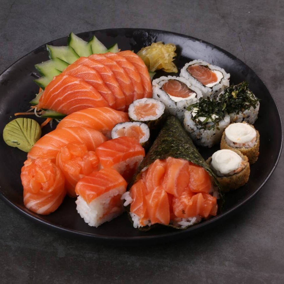 5 sashimi de salmão 5 niguiri de salmão 5 uramaki de salmão 5 shakemaki 5 kapamaki 5 hot holl couve crispy