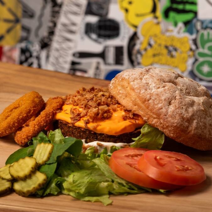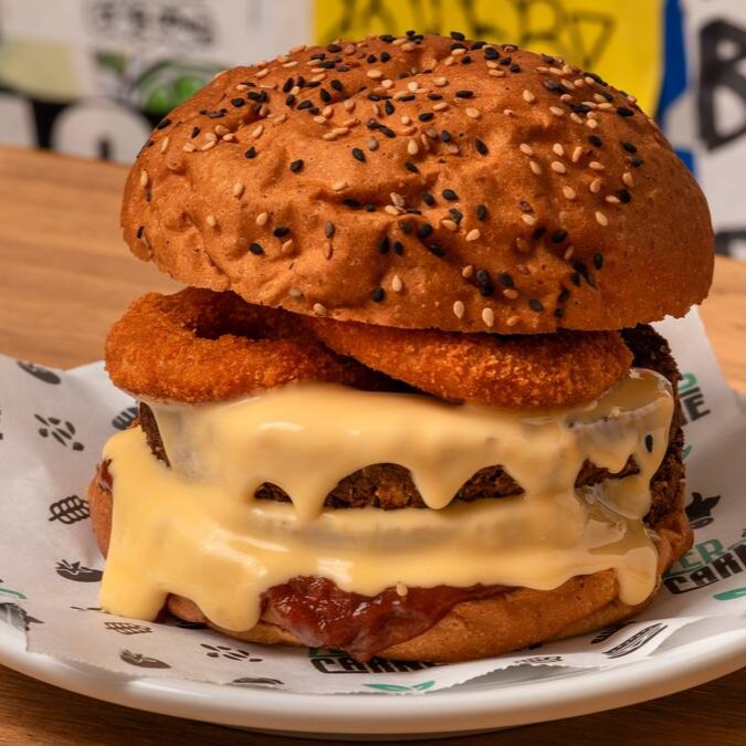 Que fome, amigos! O maior de nossos hambúrgueres, alguns dizem que é o melhor.. São dois burguers de ervilha sabor carne, muito american cheese (ou cheddar veg), duas onion rings e barbecue da casa no pão vermelho tostadinho com gergelim preto.