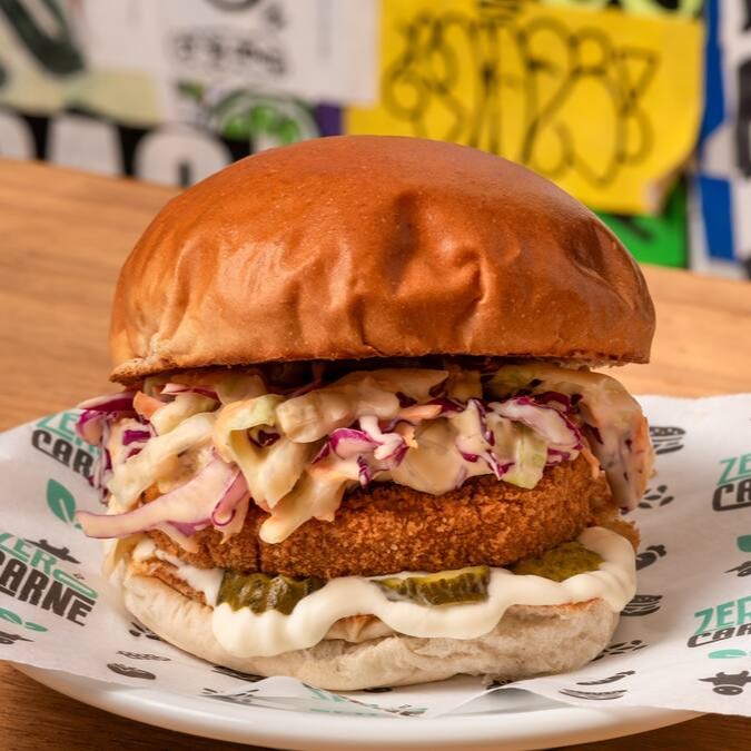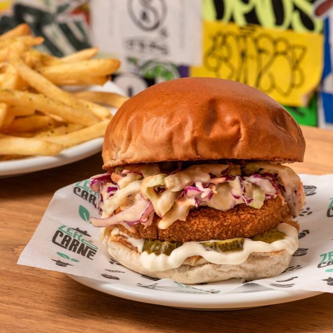 100% Plant-based. Hambúrguer de frango vegetal empanado, maionese tradicional, picles e "coleslaw": repolho verde e roxo, cenoura, maionese e especiarias. Tudo isso no pão tradicinal fofinho e delcioso! Não perde tempo e prove essa 8ª maravilha do mundo você também!!!