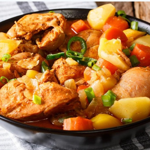 Arroz branco soltinho com açafrão, pedaços de peito de frango com cubinhos, milho, cenoura, tomate e cebola picadinhos e temperos especiais.